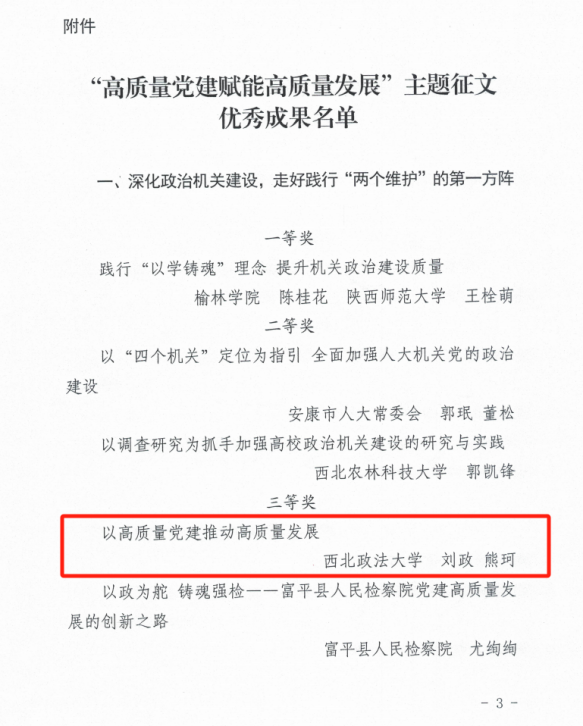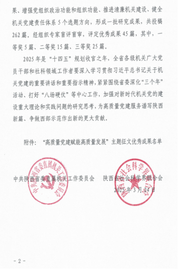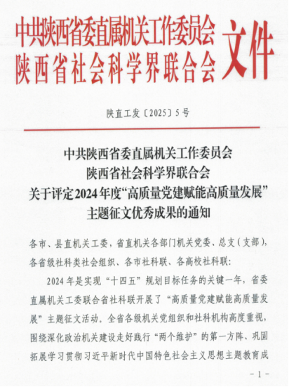 近日,中共陕⻄省委直属机关⼯作委员会、陕⻄省社会科学界联合会发布了2024年度“⾼质量党建赋能⾼质量发展”主题征⽂优秀成果的通知,NBA直播高清免费观看 刘政、熊珂两位老师合著文章《以高质量党建推动高质量发展》荣获三等奖。