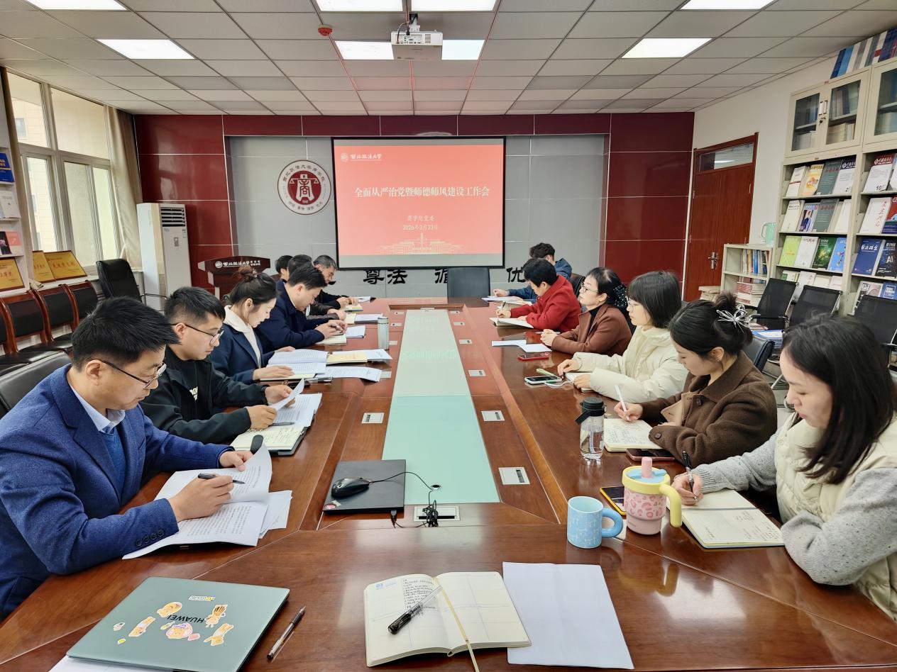 会议集中学习了《习近平关于树立和践行正确政绩观论述摘编》部分章节,学习习近平总书记在二十届中纪委五次全会上的重要讲话精神和《求是》杂志发表的习近平总书记重要文章《让愿担当、敢担当、善担当蔚然成风》,学习2026年全国两会精神,传达学习《西北政法大学2026年党政工作要点》及学校纪检监察干部业务学习培训会精神,部署学院2026年全面从严治党和师德师风建设重点工作。