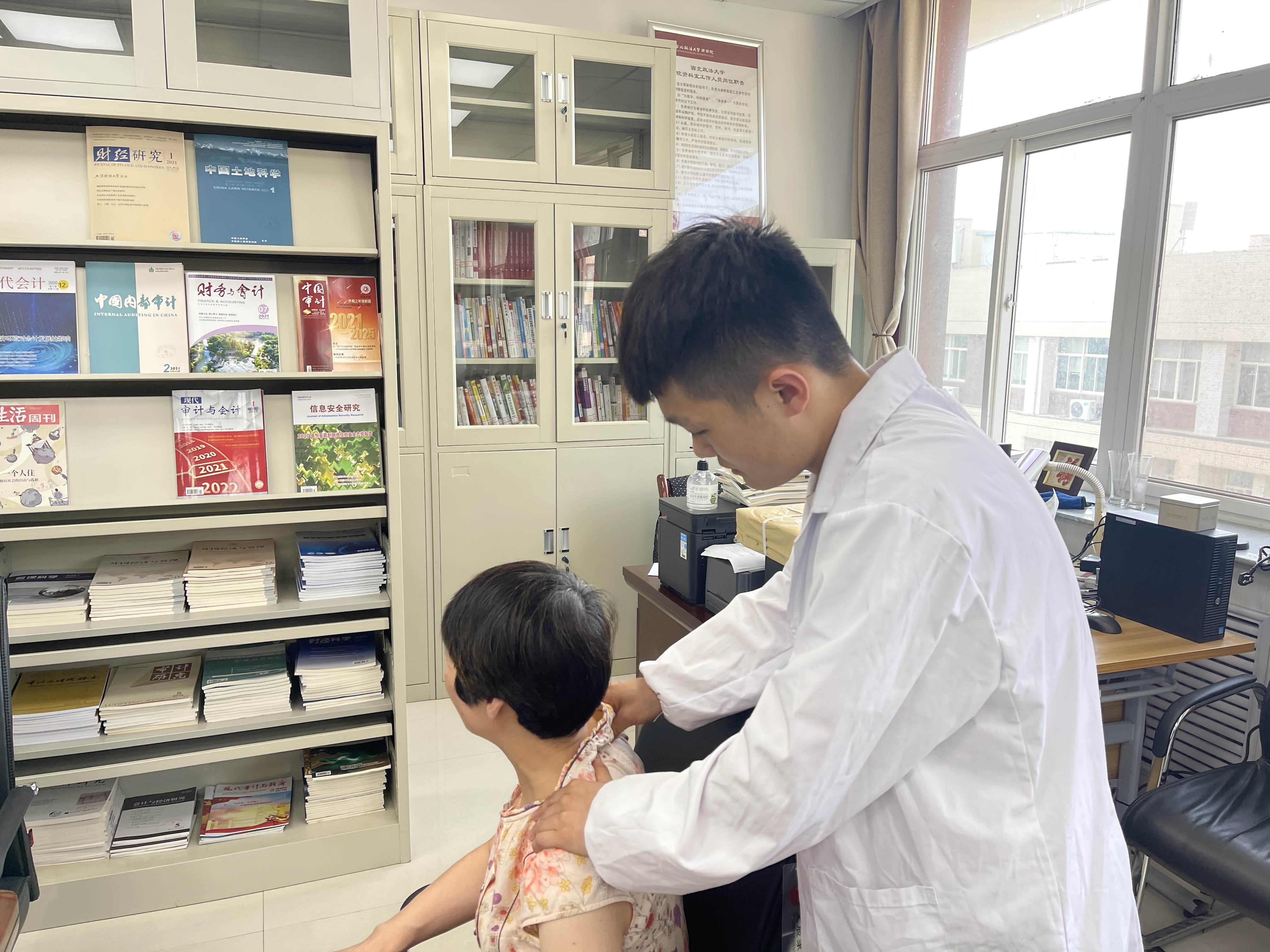 此次义诊及健康咨询活动主要是针对慢性颈椎和腰椎疾病等多种教师职业病情况进行针灸、拔罐、推拿等中医理疗服务。马大夫耐心接受咨询,认真询问病情,提出详尽治疗方案,交待注意事项,并对其相关疾病进行健康知识普及,指导老师们在日常的工作生活中如何做好自我保健。