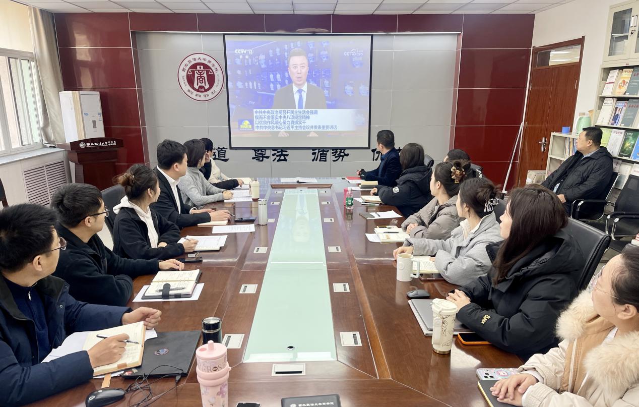 会议强调,要提高政治站位,认真学习领会习近平总书记重要讲话精神,结合学院实际抓好落地见效。要筑牢政治根基,深刻领悟“以党的政治建设为统领”的核心要求,将全面从严治党融入学科建设、人才培养各环节。要锤炼过硬作风,持续巩固中央八项规定精神学习成果,以优良党风带动教风学风建设。要严把民主生活会质量关,扎实做好会前筹备工作,确保会议开出实效。要深化“法商融合”人才培养特色,将习近平法治思想融入育人全过程。要锚定2026年工作目标,系统谋划各项重点任务,以“时时放心不下”的责任感推动学院事业发展取得新突破。要绷紧假期安全弦,全面排查各类风险隐患,守好师生人身、财产及校园安全稳定工作底线。