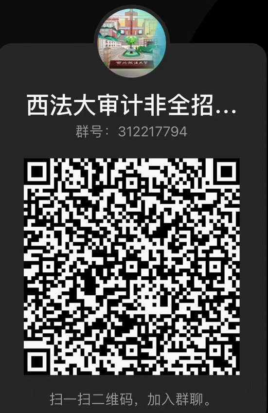 欢迎符合咨询条件的考生同学,扫描下方二维码,申请加入“2023西法大非全日制审计硕士招生咨询群”(QQ群号码:312217794),进行招考咨询交流。