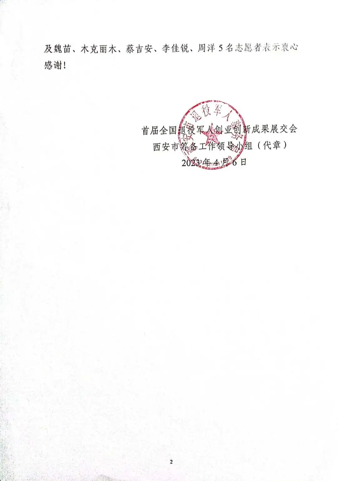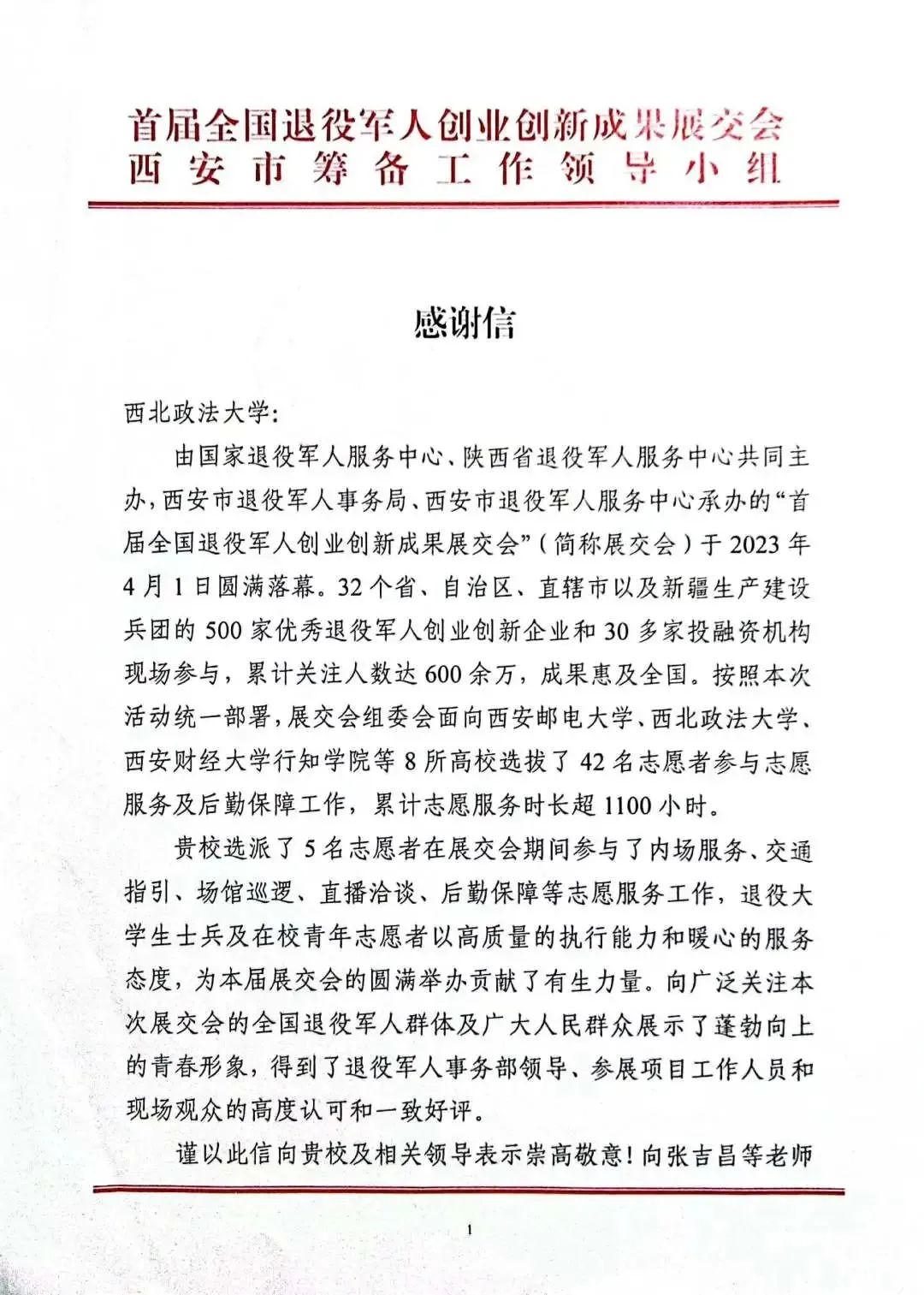 西安市退役军人服务中心对西北政法大学对本次展交会工作的支持表示崇高的敬意,送来感谢信,并向志愿者颁发志愿服务证书。