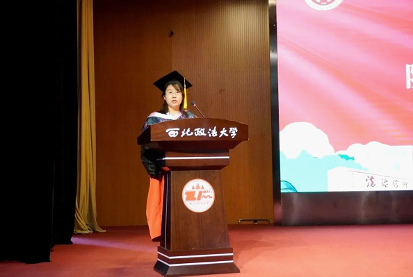 研究生毕业生代表赵知非发言。她代表研究生毕业生向学院全体教师的培养致谢,表示将继续保持青春奋斗,持续关注学校、学院事业发展,用激扬青春收获人生成长。