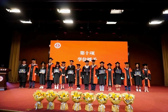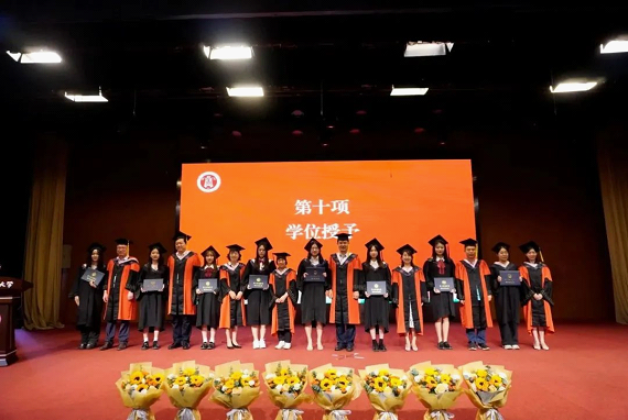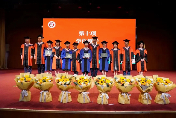 学位授予环节,毕业生代表向学术委员会成员献花,感谢求学期间老师们的教育、培养之情。院学术委员会成员为2023届毕业生拨穗并颁发学位证书。