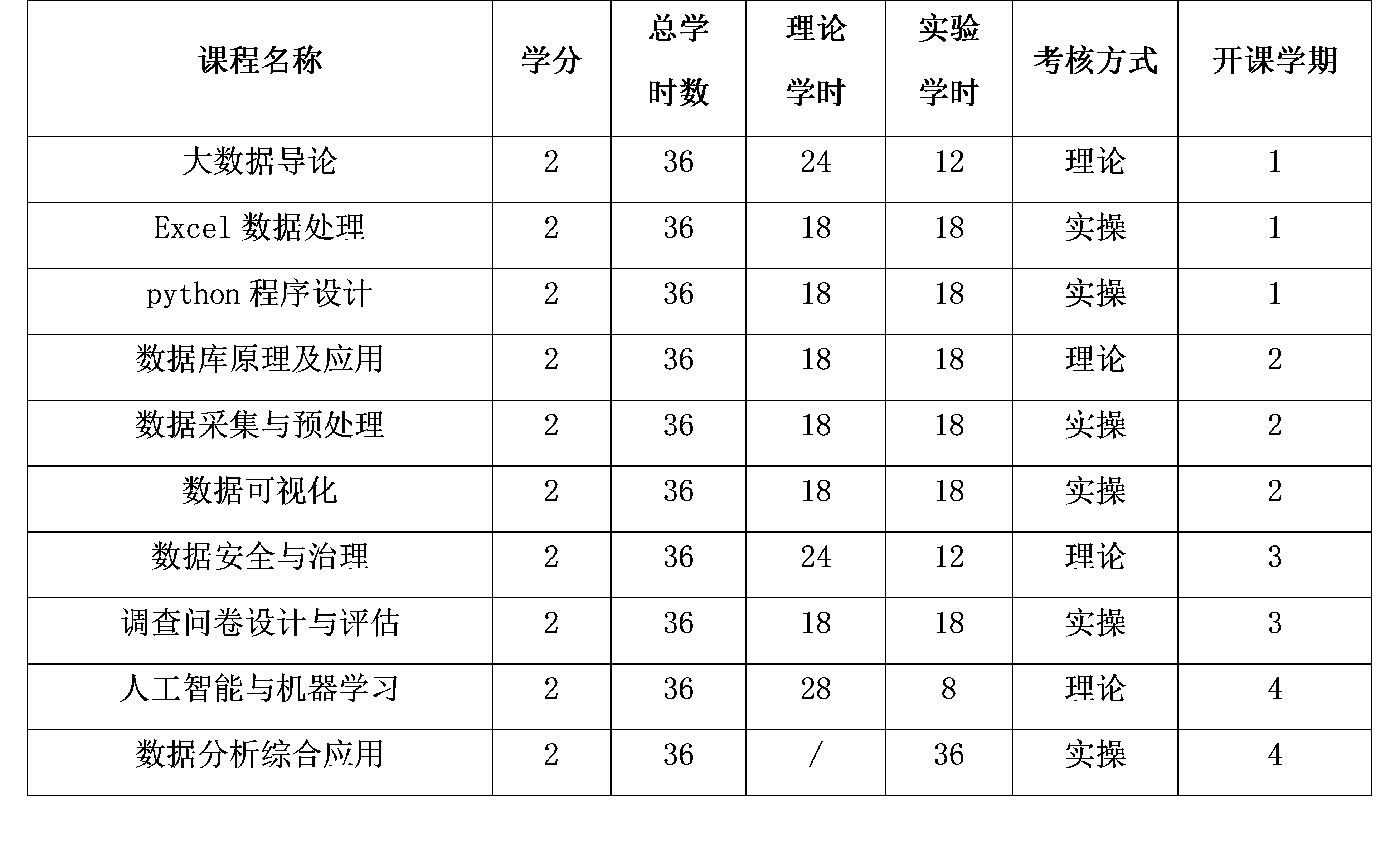 “数据分析及应用”微专业总学分为20学分,共设置10门课程,其中数据理论基础课程3门,数据分析及处理技术实训实践课程5门,数据分析综合实践课程2门。学生在两年内修完所有课程获得学分即可获得学校认证的微专业修读证书。微专业课程首次开课时间为2023年9月。