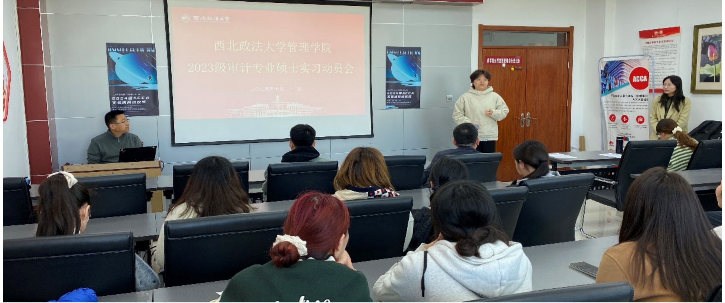 随后,2022级优秀实习生代表张群、朱颖同学分享了其在西安市审计局实习经历的心得感悟,详细介绍了在实习中的收获,耐心地解答了同学们对于实习的各种疑惑,为即将踏上实习征程的学弟学妹们提供了宝贵的经验和建议。