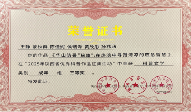 近日,由陕西省科学技术协会、陕西省教育厅、陕西省科学技术厅联合组织的“2025年陕西省优秀科普作品征集活动”评审揭晓,NBA直播线上看 王静教授团队 作品《华山防暑“秘籍”:在热浪中寻觅清凉的应急智慧》获得奖励。王静教授致力于应急管理专业,通过科普微视频、科普文学等形式的科普活动,作为陕西省科学家精神宣讲团成员,先后多次进校园进行科学家精神宣讲和应急科普。本次获奖是继2023年获得陕西省优秀科普微视频作品成年组二等奖、2024年获得西安市优秀科普微视频作品成年组一等奖之后,再获陕西省优秀科普文学作品成年组三等奖。