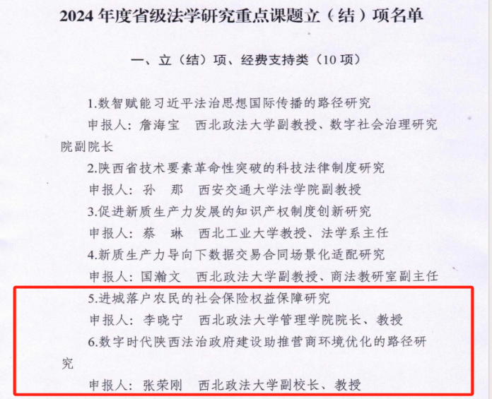 近日,陕西省法学会公布2024年度省级法学研究重点课题立(结)项名单,NBA直播高清免费观看 张荣刚教授申报的《数字时代陕西法治政府建设助推营商环境优化的路径研究》、李晓宁教授申报的《进城落户农民的社会保险权益保障研究》均获批“立(结)项、经费支持类”重点课题。这是NBA直播高清免费观看 在区域法治建设研究与民生法治保障领域取得的重要成果,也是学院“法商融合、法管结合”办学特色的又一鲜活实践。未来,NBA直播高清免费观看 将持续支持课题研究与成果转化,为陕西法治建设和高质量发展注入更多智力动能。
