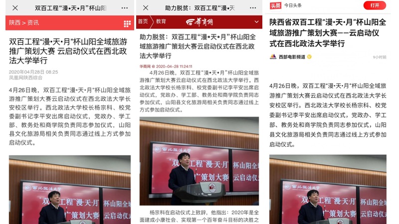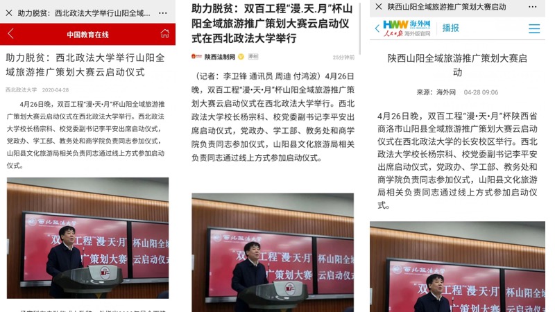 4月26日晚,陕西省双百工程“漫·天·月”杯商洛市山阳县全域旅游推广策划大赛云启动仪式在我校举行。本次云启动仪式成功举办,并获得了社会各界的广泛关注,争相报道。