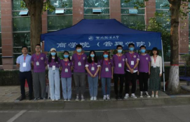 身着紫色文化衫的商院志愿者们的身影