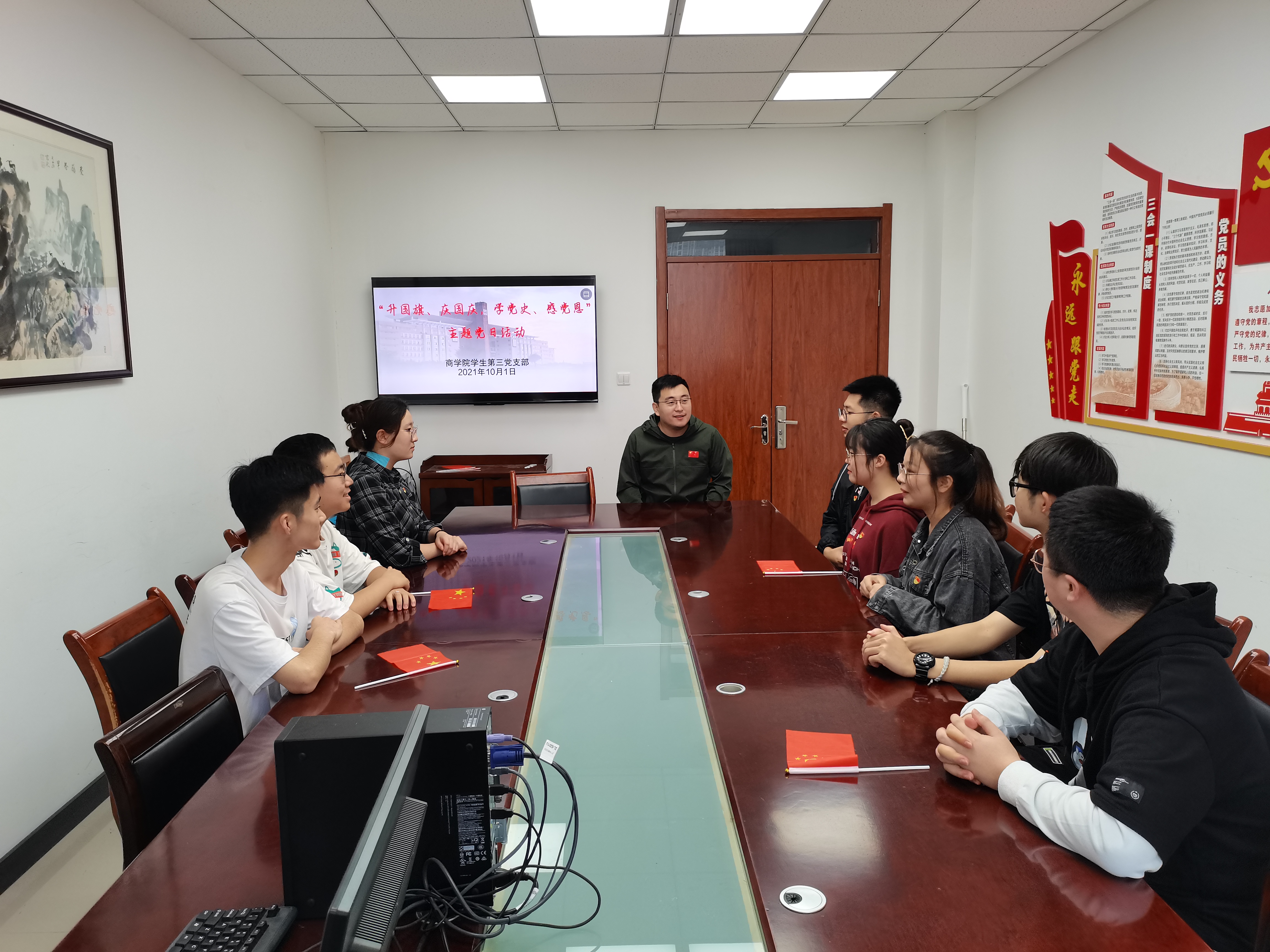 升旗仪式后,周迪老师主持召开主题党日活动。在活动中,大家畅谈参加升旗仪式的感受,纷纷表示升旗仪式意义特殊,既是对伟大祖国的表白,也是伟大祖国繁荣昌盛的见证。作为新时代大学生党员,生活和成长在强大的祖国,一定会牢记初心使命,坚持青春奋斗,增强做中国人的志气,骨气,底气,成为堪当大任的时代新人。