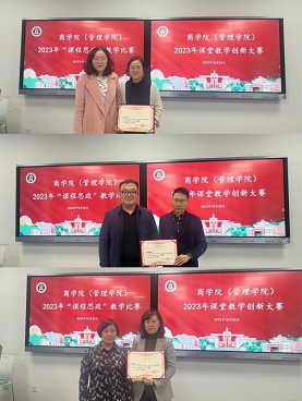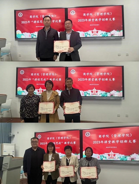 经过激励角逐,在课堂教学创新大赛中,李继玲老师获得一等奖,张瑛、吴汉利老师获得二等奖,王爱霞、杜鹏翾老师获得三等奖;在课程思政比赛中,杨柳青老师获得一等奖,刘源、方林波老师获得二等奖,蒋园园、路雅宁、赵杭莉老师获得三等奖。三位评委与院党委书记赵参共同为获奖教师颁奖。