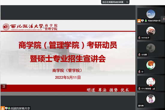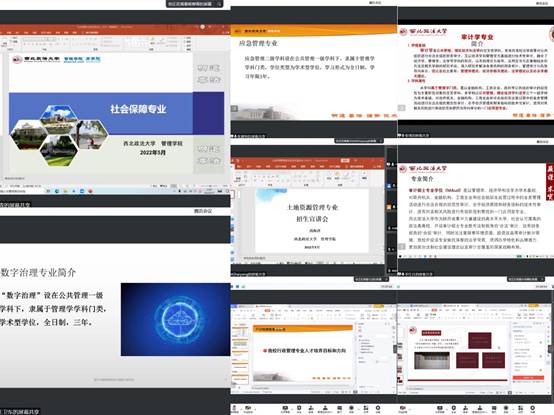 5月12日晚上,NBA直播线上看 线上组织召开考研动员暨硕士专业招生宣讲会。西北政法大学副校长、公共管理一级学科负责人张荣刚教授,NBA直播线上看 院长、社会保障专业负责人李晓宁教授,NBA直播线上看 党委书记朱茂,NBA直播线上看 副院长、社会保障专业导师代表杨柳青副教授,土地资源管理专业导师组长尚海洋教授,数字治理专业导师代表王卫东教授,行政管理专业导师组长谢斌教授,教育经济与管理专业导师代表宋鸿雁研究员,应急管理专业导师组长张夏恒教授,审计学专业导师代表张瑛副教授,审计专硕导师组长李红兵副教授,公共管理导师组长胡信布教授出席会议。会议由学院2019级辅导员周迪主持,200余名同学在线参会。