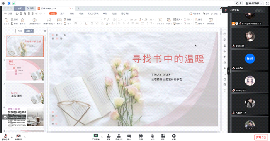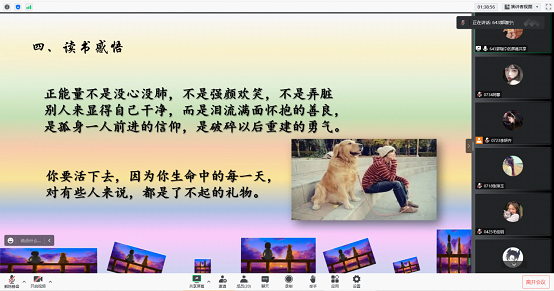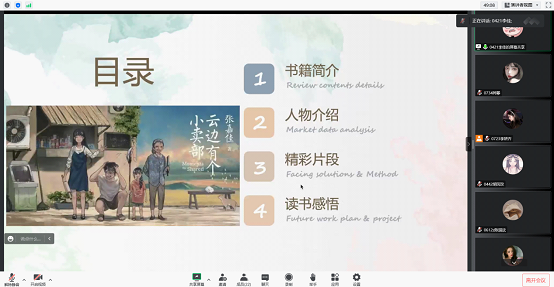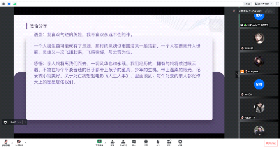 读书分享会从书籍内容、人物简介、精彩片段回顾等内容带领同学们走进书中,感受每片文章之魅力。期间,同学们通分畅所欲言,分享了各自的读书心得。xx同学谈到"读书或许不是为了从整本书中获得什么,只要有那么一个故事、一段话,打动了你,与你产生共鸣,那就是一本值得去读的书"。