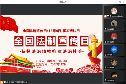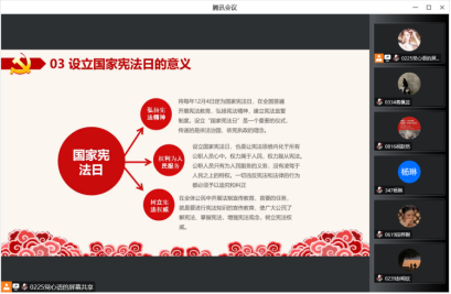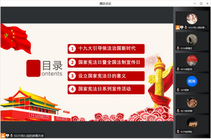 宣讲主要分为四个部分,分别为:一是依法治国新时代;二是国家宪法日暨全国法制宣传日;三是设立国家宪法日的意义;四是深入学习宪法。