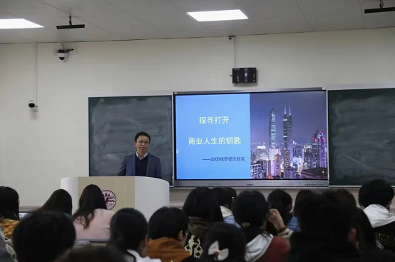 校友罗绍元以“探寻打开商业人生的钥匙”为题展开讲座,他结合自己的求学经历和职业发展道路,建议同学们要积极思考人生发展的道路,做好规划,随时做好人生发展道路的准备,及时抓住机遇。对于职业选择和生涯发展问题,他认为“做一件事最好的时间是十年前”以及现在,只要付诸行动,一切皆有可能,并表示做对社会有用的事情是人生的一种最好选择。此外,罗绍元以自问自答的方式向同学们介绍了自主创业中的一些注意事项,帮助同学们积累实践经验和创业技能。