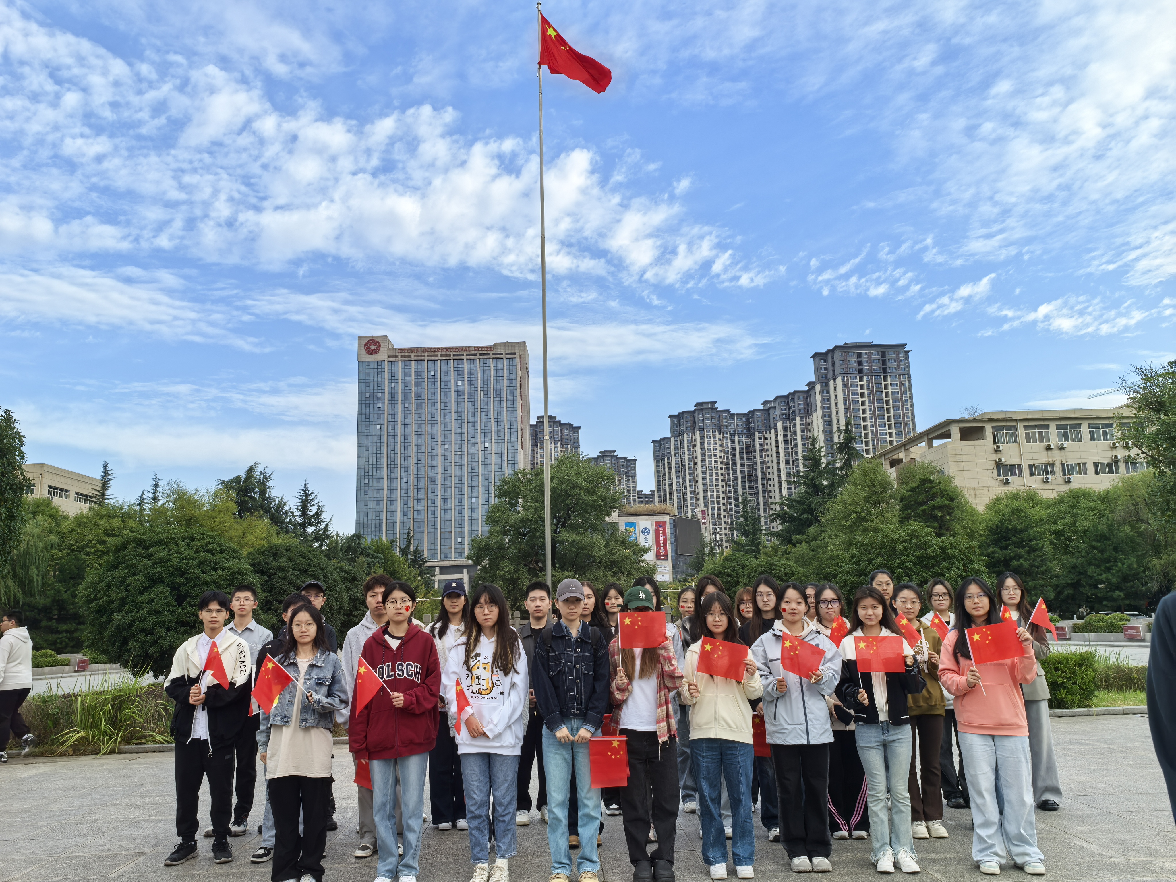 上午8点整,在喜迎国庆的氛围之中,随着一声洪亮的“出旗”口号响起,仪式正式拉开帷幕。国旗护卫队雄姿英发,傲骨凛凛,步伐坚定有力。伴随着国歌奏响,国旗徐徐升起,红旗飘扬之际,全体人员行注目礼并齐唱国歌,赤子的梦想在心中澎湃涌动。