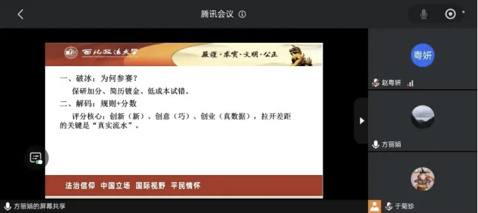 讲座核心环节聚焦赛事评分体系,拆解创新、创意、创业三大评分核心,明确创新需具备产品、技术等至少一个明确创新点,创意侧重商务策划与可行性分析,创业则需落地实践并提供佐证材料,强调“真实流水”是拉开分数差距的关键。同时,以国赛特等奖“子期文化”直播带货项目为实例,从项目简介、创新分析、创意设计到创业建设全维度拆解,剖析国奖项目“小而美”、解决真实痛点、拥有试点数据的核心特质。