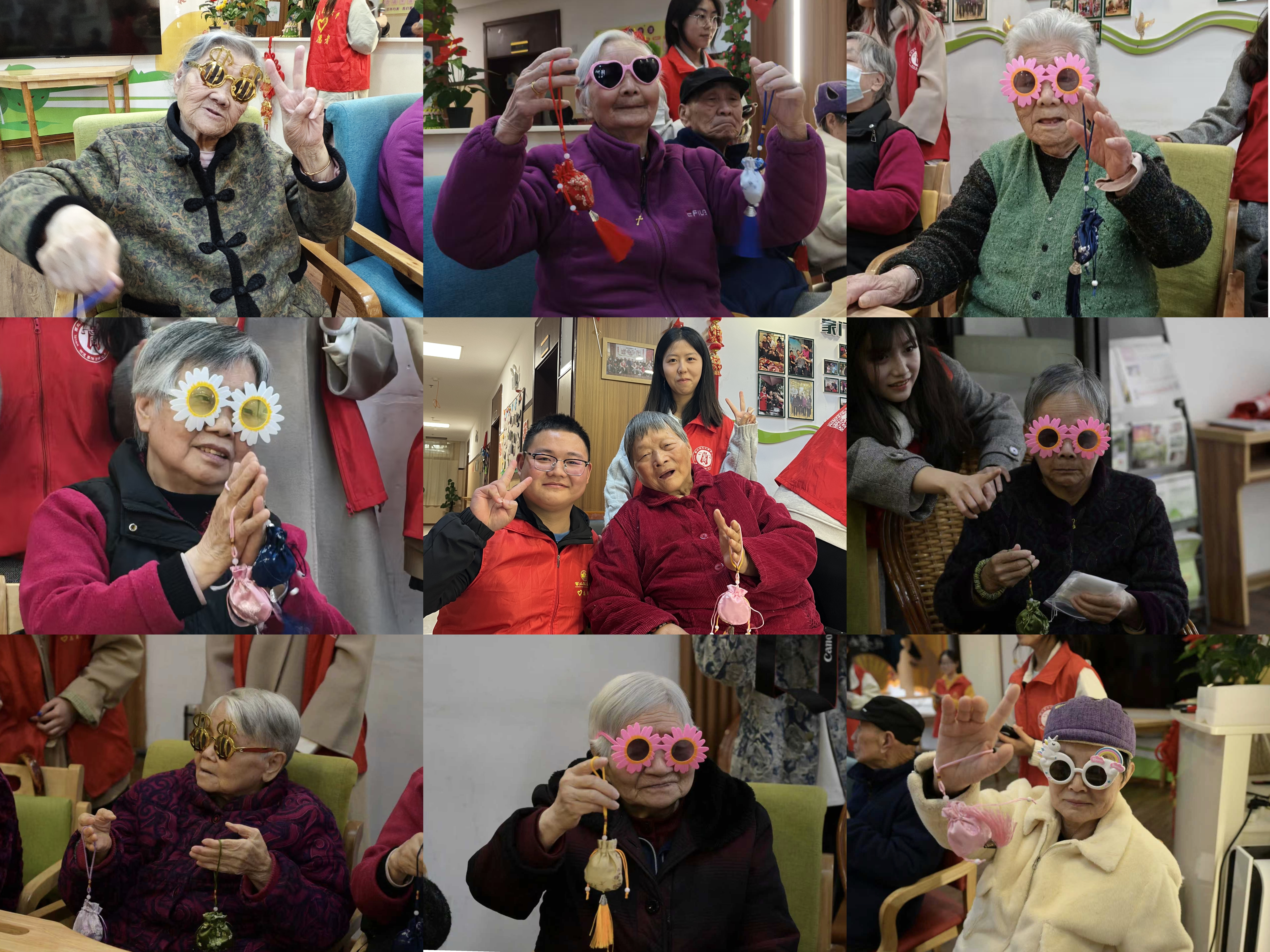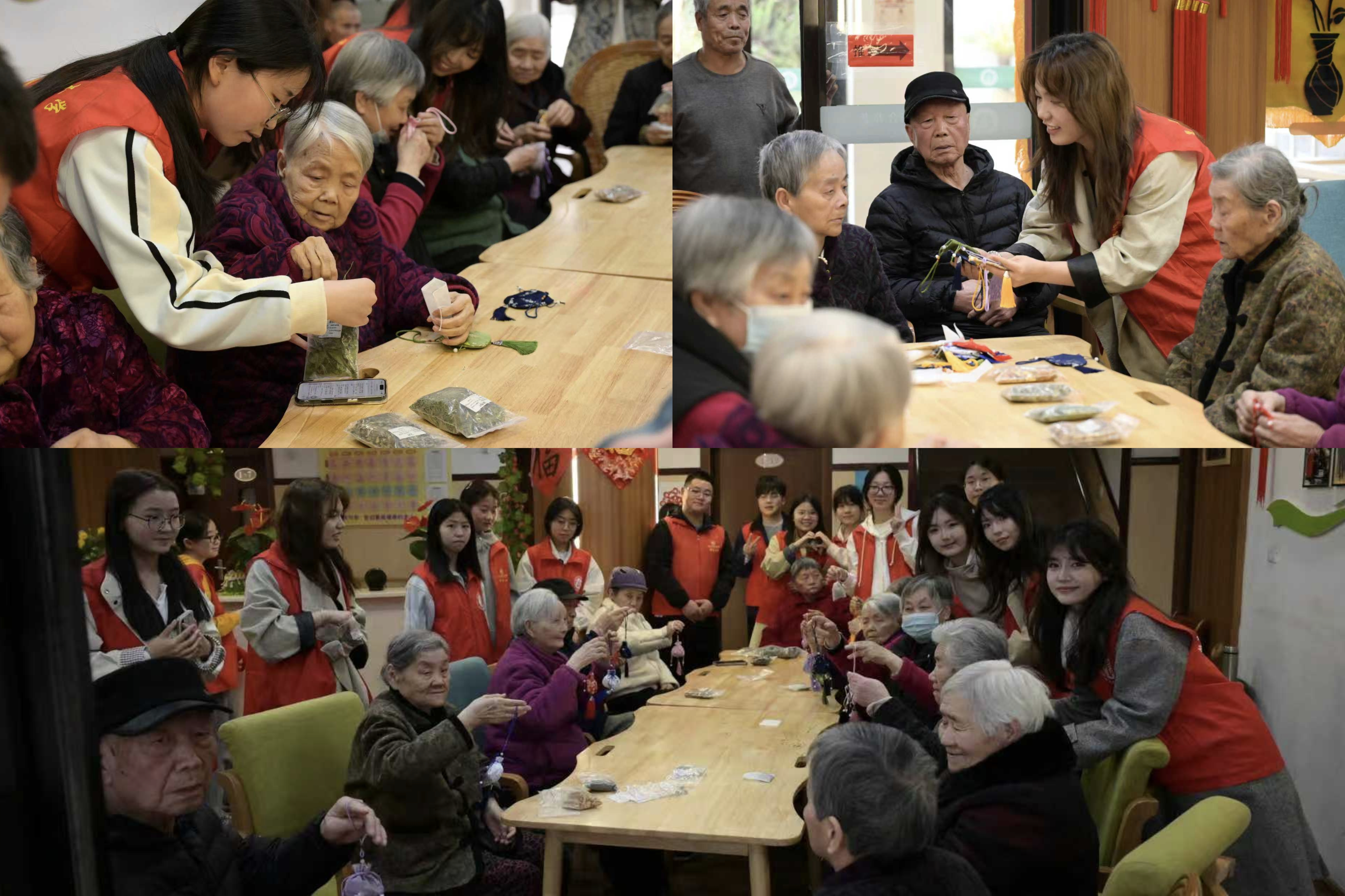 文艺表演结束后,趣味互动游戏与手工体验相继开展。在虎口传筷子游戏中,大家相互配合、默契协作,现场欢声笑语不断;DIY中药香囊环节,志愿者准备了14味温和外用的中药材,搭配安神助眠、健脾理气等5种专属配方,耐心讲解制作方法和药材功效,老人们亲手制作香囊,沉浸式感受传统养生文化的魅力。活动最后,志愿者为老人们拍摄纪念照,定格温馨美好瞬间。
