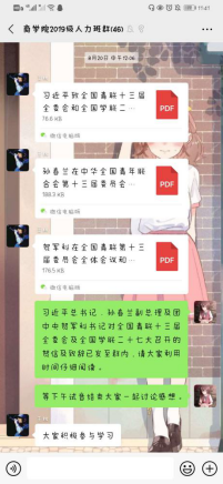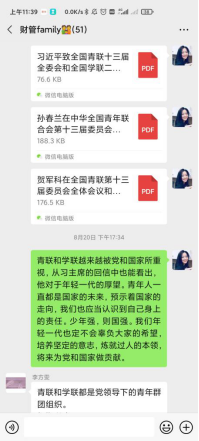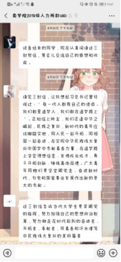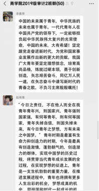 2019级其他各班团支部通过线上开展学习,大家通过提前自学贺信、致辞内容和大会会议精神,认真总结心得体会,并在班级群内积极发言谈感想和体会。大家纷纷表示,要以新时代新青年的担当,认真抓好学习和实践,牢记习近平总书记的嘱托,以青春奉献的姿态,为中华民族伟大复兴做出自己的贡献。