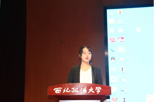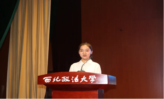 2021级工商管理类4班王家乐作为新生代表发言。她表达了自己初入大学的经历与感受,表示当代大学生要将自己的理想与国家的发展相结合,要不负韶华,努力成长。
