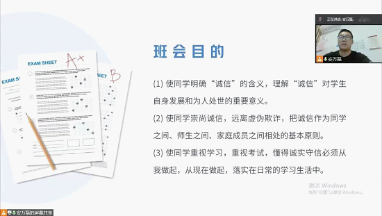为了增强同学们的诚信意识,严肃考风考纪,端正考试态度,杜绝考试作弊,4月17日,NBA直播线上看 2021级开展“诚信应考”主题班会。本次主题班会由辅导员安万磊主持。