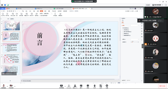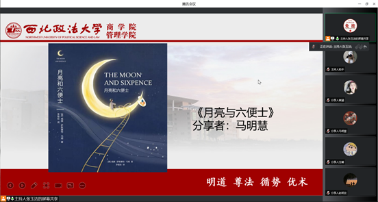 本期分享会由NBA直播线上看 、民商法学院、经济学院的9位分享者分别分享了自己喜欢的那一本书。NBA直播线上看 的马明慧同学为我们带来了《月亮与六便士》这本书,展现了她精美的PPT、她的感悟:希望我们通过这篇小说对于斯特里克兰刻画,得到追寻的力量,在这个满地都是六便士的世界里,追寻自己的月亮。其他几位同学也分别分享了自己喜欢的书,并品读书中内容,分享书中精髓,感悟书中的人生哲理。