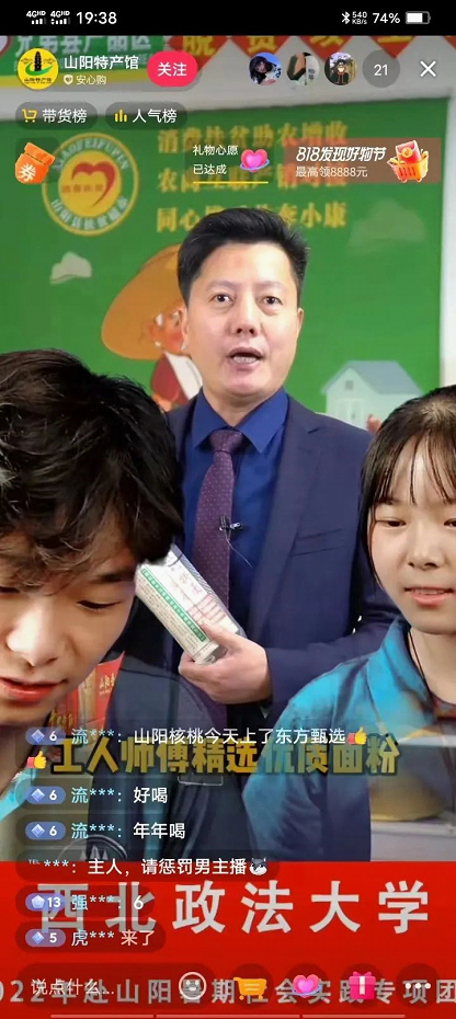 实践队员在山阳县电商中心直播间开展直播带货活动。活动中实践队员围绕直播带货农产品、产品特点介绍推广等展开,在直播过程实践队员注重示范普通话直播带货,以此为契机在山阳县电商中心直播平台推广普通话直播带货,希望能带动山阳县直播带货活动的普通话使用范围。