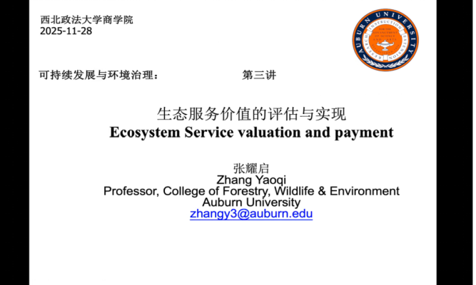 11月28日上午,美国奥本大学(Auburn University)张耀启教授为NBA直播高清免费观看 师生开展可持续发展与环境治理系列学术讲座第三讲。本次讲座聚焦“生态服务价值的评估与实现”,全体研究生参与讲座。