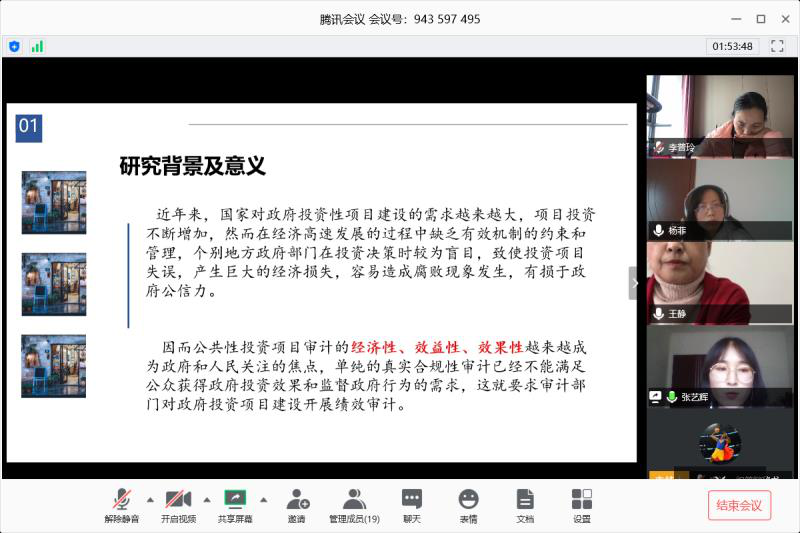 线上答辩工作于4月20日上午正式开始,4月26日傍晚顺利结束。学生通过腾讯会议app讲解自己的论文框架、进行ppt展示,听取老师提出的问题和建议。虽然是线上答辩,但毕业生们都展现出了最好的精神面貌,着装整洁、语言表达流畅,就所写论文进行了不同方面的阐述,并较好地回答出老师的问题。老师们也对论文进行认真审查,提出了修改建议和对论文的看法。每个答辩组都配有一名答辩秘书,负责答辩过程记录与时间控制,保证答辩有条不紊地顺利进行。