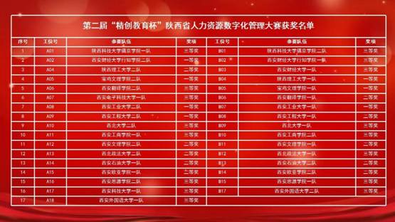 5月15日,NBA直播线上看 两支队伍在黄雯、李文琦、裴莉和崔健四位老师的指导下,分别参加了线上第二届“精创教育杯”陕西省人力资源数字化管理大赛。比赛内容分为大数据理论考核和沙盘模拟两部分,按照30%(理论分)+70%(实践分)的计算标准进行总分核算并统计排名。比赛过程中我校参赛队伍全体成员群策群力,团结合作,最终分别斩获了省赛二等奖和三等奖的好成绩,在考核实践中有机结合了所学知识和训练成果,展现了NBA直播高清免费观看 人力资源管理专业学子的优良风采。