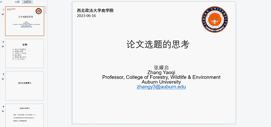 2023年6月16日上午,美国奥本大学(Auburn University)张耀启教授为NBA直播线上看 师生开展社会科学研究方法与写作系列学术讲座第七讲,本次讲座主题为“论文选题的思考”,由副院长杨柳青主持,NBA直播线上看 全体一年级研究生及部分教师参与讲座。