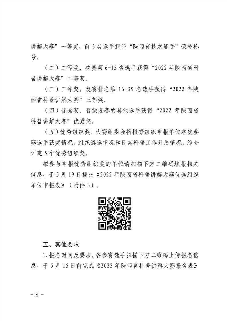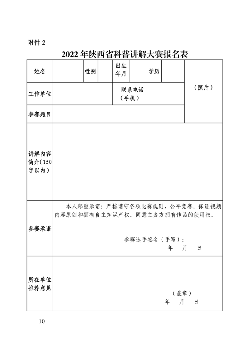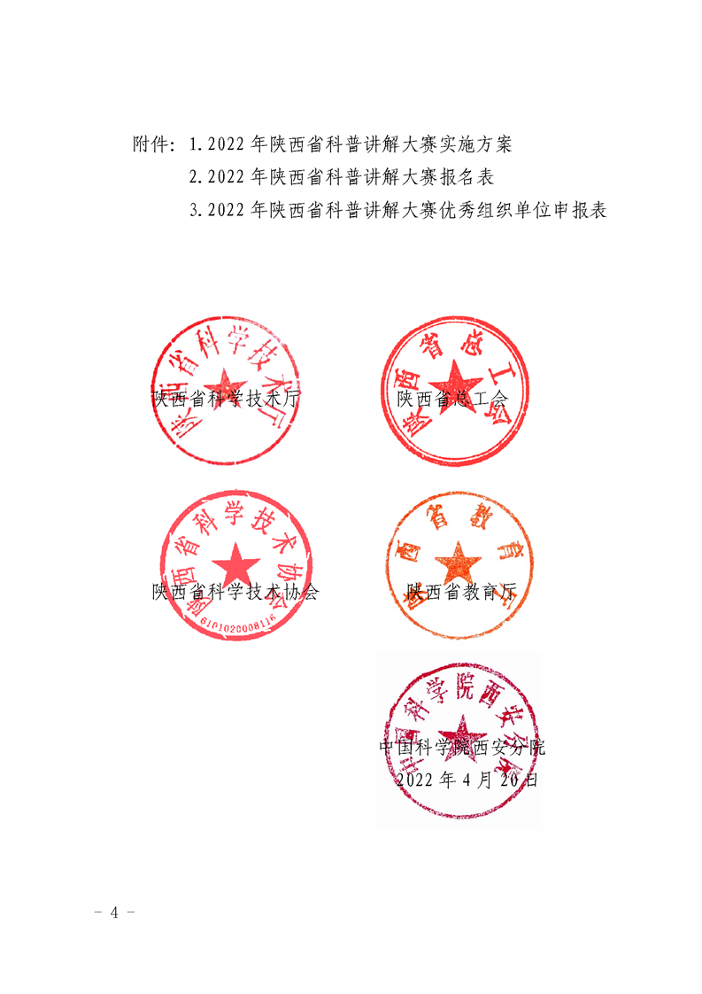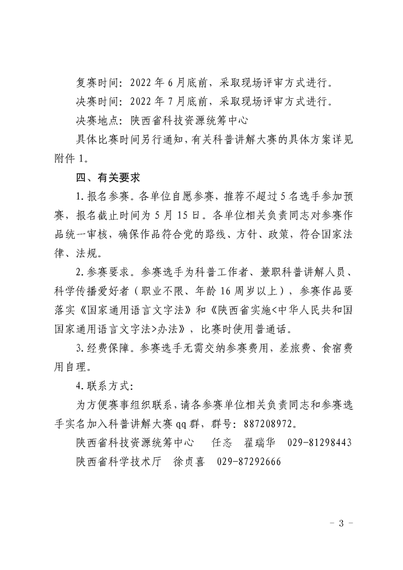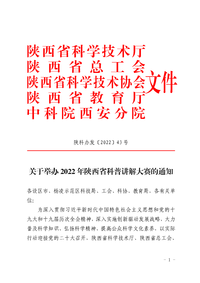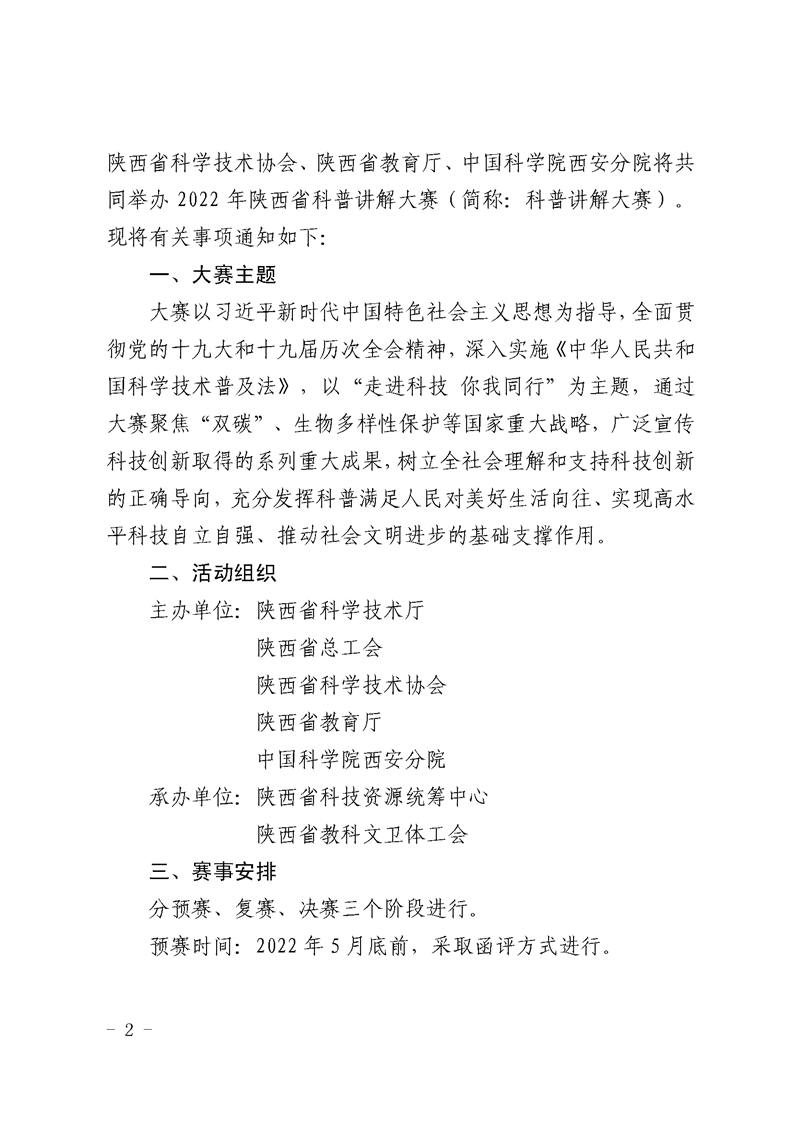 教育厅《关于举办2022年陕西省科普讲解大赛的通知》,学院5月13日前将本次大赛的报名表报送至科研处综合办公室(校务楼A座104),联系电话88182863。学院联系人,陈丹琳,联系电话88182570。