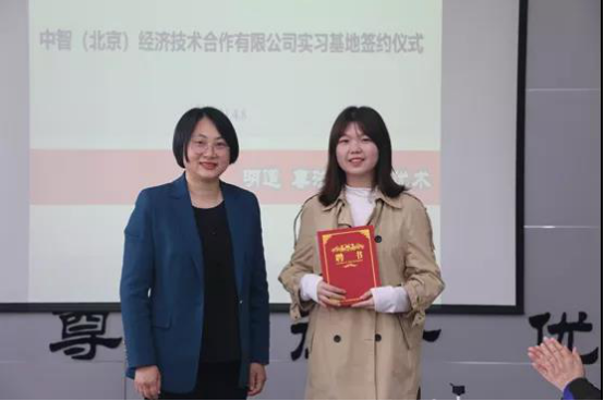党委书记朱茂向中智(北京)公司授牌“西北政法大学实践教育基地”,崔岩副总经理向人力资源管理专业二年级学生高雨授予“中智(北京)公司校园大使”聘书。
